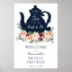Bienvenidos a la despedida de soltera con este hermoso cartel que presenta una tetera azul marino con "Té para pasar el rato con la futura novia" en divertida letra script. Cuenta con flores de color burdeos, rosa, naranja y coral. Agregue el nombre de la homenajeada, la fecha de la celebración y el texto de bienvenida personalizado utilizando los campos proporcionados.