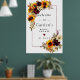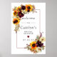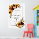 Diseño floral de otoño elegante compuesto por flores de otoño - girasoles amarillos, rosas rojas, peonías moradas e hydrangeas blancas - todas anidadas en hojas de otoño. Una forma hermosa y elegante de dar la bienvenida a los invitados a una lluvia de regalos de otoño para la novia. Esta plantilla de bricolaje es parte de la colección Sunflower y Burgundy que te ayuda a crear fácilmente una lluvia de regalos para la novia única y personalizada. Deberías ver un enlace a ella en esta página. Si no ves el enlace o necesitas ayuda con un artículo, por favor contáctame.