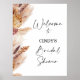 Este cartel de bienvenida para ducha de novia presenta un arreglo floral seco bohemio en tonos naturales con hierba de pampas y texto de caligrafía moderna.