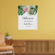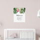 Cartel de bienvenida para ducha de novia moderno con ilustración de acuarela de hojas de monstera, hoja de palma y flor de protea rey rosa. Perfecto para tu fiesta de verano.