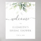Hermoso cartel de bienvenida para ducha de novia con eucalipto en acuarela y hojas doradas.