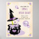 ¡El amor está en el aire! Un letrero de bienvenida para una despedida de soltera de Halloween con temática de bruja de color lavanda morado claro y negro es ¡más dulce que espeluznante! La novia ha lanzado un hechizo sobre el futuro novio. Un caldero rebosa corazones y una cuchara de madera con un sombrero de bruja adornado con rosas púrpuras. Un fondo con aspecto de pergamino y el caldero se pueden personalizar con las iniciales y el monograma de la novia y el novio. Arte © Chrissy H. Studios, LLC. Todos los derechos reservados.