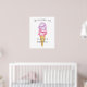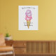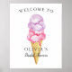 Cartel de bienvenida caprichoso para fiesta de soltera con ilustración de acuarela de bolas de helado rosadas y moradas en un cono de waffle.