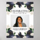 Un cartel de bienvenida para funeral que presenta rosas florales de color azul marino y blanco con follaje verde y acentos de oro falso, una fotografía de su ser querido, su nombre y fechas.