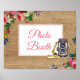 Cartel de boda con cabina de fotos de flores de seda rosa y borgoña