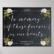 Un hermoso cartel de boda "en memoria" para mostrar en su boda/ baby shower/fiesta etc. Un diseño floral marfil sobre un fondo con efecto pizarra. Fácil de editar o borrar los nombres y la fecha.