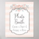 Cartel de cabina de fotos para baby shower, despedida de soltera o boda en tonos pastel claro con rayas rosadas y texto manuscrito en gris oscuro, flores azules y rosadas vintage y marco rústico. Perfecto para una baby shower rústica para una niña, boda o despedida de soltera.