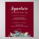 Esta señal de cócteles emblemáticos de verde de invierno de Burdeos es perfecta para una boda elegante. El diseño moderno de otoño o invierno tiene un ambiente festivo rústico, con sencillas hojas de olivo oscuras y vegetación en acuarela sobre un fondo rico en Burdeos.