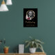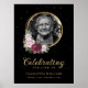 Elegante cartel de bienvenida de funeral floral personalizado negro y dorado con un marco de foto dorado con flores rojas burdeos y rosadas sobre un fondo de carbón oscuro. Para solicitudes personalizadas, por favor envíenos un mensaje a través del chat de Zazzle.