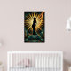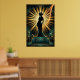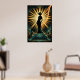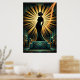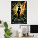 Una sofisticada silueta de una mujer con un vestido largo de pie en un pedestal geométrico. Situado en una explosión de sol dorada radiante, esta obra de arte captura perfectamente el glamour y la elegancia de los años 20 "Gran Gatsby".