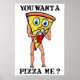 A funny cartoon on a pizza wearing boxing gloves. The pizza has big blue eyes and is standing up ready for a boxing match. The slogan reads "you want a pizza me"