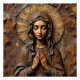 "This striking design presents a portrait of the Virgin Mary as a detailed wood carving or relief sculpture, rendered in rich, warm brown and reddish-brown tones. She is depicted with a tranquil, contemplative expression, hands clasped in prayer, and is framed by a rustic, textured halo. The rough, earthy texture of the wood grain provides a powerful sense of ancient, grounded spirituality. This design is highly suitable for products with a rustic, spiritual, or devotional theme. Imagine it on wooden plaques, religious art prints, handcrafted items, or home decor that evokes a traditional, artisan aesthetic."
