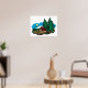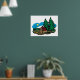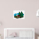 Una casita de madera en el bosque, entre los árboles. Este diseño parece realmente efectivo en este Poster