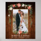 Elegante Acuarela Floral de Invierno Oro Foto de Recién Casados Navidad Tarjeta postal Casados y Alegre incluye hermosas flores de Nochebuena rojas en acuarela, vegetación botánica, follaje de invierno, bayas de acebo, rosas blancas, algodón, piñas y bayas azules. Campo Rústico de Madera.