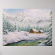 Casas de Madera de Acuarela y Árbol de Pino en Poster de Nieve.
