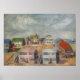 Este poster presenta una pintura al óleo original de Anna Unterman de una pequeña isla a orillas de Nueva Jersey. Una caprichosa agrupación de casas de playa se agrupa alrededor de un patio central de arena con un colorido tendedero lleno de ropa que sopla en la brisa. Cada casa tiene un color pastel diferente: rosa, azul, blanco, verde y marrón. La bahía se encuentra al fondo con un barco de vela. El cielo está parcialmente nublado. Reproducida con permiso de la finca de Anna Unterman. Todos Los Derechos Reservados.