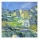 Casas en Provenza. Paul Cezanne. Un hermoso paisaje en colores cálidos. Gran casa amarilla con techo de tejas rojas. Los árboles crecen cerca de la casa. Cielo azul con nubes. Reproducción de obras famosas de imágenes artísticas de dominio público.