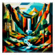 A.I. creó la interpretación a partir de mi descripción de un paisaje cubista estilizado que muestra montañas angulares con diversos tonos de azul, verde y amarillo que transmiten un sentido de profundidad y luz. Una cascada fluye por el terreno rocoso, contrastando marcadamente con las formas geométricas que componen las montañas y el cielo.