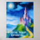 Afiche en un castillo en la cima de una colina con una carretera que conduce a la puerta, y un cielo nocturno con luna llena y estrellas. El texto le recuerda que "siga sus sueños".