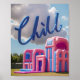 Este diseño presenta un texto 3D vibrante “Chill” en azul brillante, colocado sobre un fondo de un castillo inflable y un cielo azul claro con nubes esponjosas. La fuente juguetona y audaz captura la esencia de la relajación y la diversión, perfecta para cualquiera que busque expresar su amor por la vibra relajada y los días soleados.