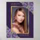 Elegante letrero de bienvenida de celebración de la vida/funeral floral púrpura con rosas púrpuras y flores de aliento de bebé que decoran una foto dentro de un marco dorado. Artículos coincidentes disponibles.