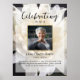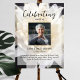 El póster conmemorativo perfecto para saludar a familiares y amigos cuando entren a la celebración de la vida de su ser querido. Especialmente para alguien que ama las flores y quizás la jardinería, el diseño presenta una foto personal cuadrada, 5 líneas de texto personalizado y una foto de fondo de un hermoso crisantemo blanco. Puede cambiar fácilmente esto por su propia foto de fondo. Clásico pero único, esta plantilla es muy fácil de personalizar y también hará un hermoso recuerdo conmemorativo.