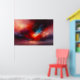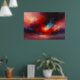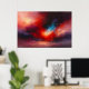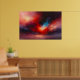 A cosmic eruption rendered in vivid reds, molten oranges, and electric blues, Celestial Emberfall captures the moment where energy and emotion collide. The painting’s fiery core radiates outward into shadowy maroons and purples, while scattered bursts of turquoise and cyan suggest particles suspended mid-transformation—like stars caught between ignition and collapse.
