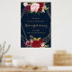 Este poster de bienvenida geométrico con un ensayo geométrico de color azul rojo oscuro es perfecto para una cena de ensayo moderna. El diseño artístico del marsala incluye acuarelas, rosas verdes, rosas, borgoñas y ondulados, decorados con una vegetación cuidada alrededor de marcos geométricos de oro en un elegante y radiante ramo de flores.