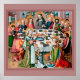 Este panel, pintado en 1503 por un anónimo artista de origen romano, muestra la cena mencionada en Juan 12:1-3 que tuvo lugar en Bethany después del levantamiento de Lázaro y justo antes de que Jesús llegara a Jerusalén el Domingo de Ramos. Como tal, el ánimo es festivo —más alegre y menos sombrío que el de la Última Cena que tuvo lugar el jueves siguiente (Jueves de Maundy). Es el panel central del retablo tríptico que honra el altar de Martha del coro sur de la Iglesia de Nuestra Señora (Liebfrauenkirche) en Oberwesel, Renania-Palatinado, Alemania. + Aquí, Jesús y Sus Doce Apóstoles están sentados en una mesa redonda, presumiblemente uno de los varios en la sala, ya que el Evangelio alude a la presencia de más asistentes, incluyendo Lázaro. La mesa se ve con normalidad, cuanto mejor se ve la vajilla y los productos alimenticios. Los apóstoles conversan entre ellos. Uno (¿San Bartolomé?) corta el pan. En el centro de frente, San Marta, con un delantal y una bandeja de pescado, sirve (como lo expresa sucintamente San Juan). Mientras tanto, Santa María, erróneamente identificada en el momento en que el retablo fue pintado con la penitente Magdalena y una mujer sin nombre pecador, arrodillada enfrente. Ambas mujeres usan batas de materiales suntuosos. Entre ellos se arrodilla el donante, Canon Peter Luteran, que está representado en una escala muy reducida. La escena llena de gente brilla con energía y el ruido implícito de las conversaciones animadas y la vajilla agitada. + Ver también los artículos de St. Martha (delantales, manoplas de horno, pólvoras y bandejas de servir) de nuestra serie Apron Saints (q.v.) para mezclar y emparejar! + Crédito de la imagen (M 055): Foto de Rolf Kranz de una pintura de dominio público con más de 100 años de antigüedad de WikiMedia Commons (por Rolf Kranz - Own work, CC BY-SA 4.0, https://commons.wikimedia.org/w/index.php?curid=106002864). La foto ha sido cortada firmemente en un rectángulo sin fronteras.