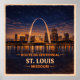 Celebre la "Puerta de entrada al Oeste" con este cartel del Centenario de St. Louis, Missouri. Conmemorando el 100º aniversario de la Ruta 66, esta obra de arte de estilo vintage presenta el majestuoso Arco Gateway que se eleva sobre el horizonte de St. Louis al anochecer. Las luces de la ciudad y el monumento icónico se reflejan hermosamente a través del río Mississippi bajo un cielo brillante lleno de estrellas, capturando la grandeza histórica de esta parada esencial de la Madre Carretera.