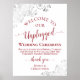 Este hermoso cartel "Sin enchufe" sirve como un delicioso saludo para los invitados bodas y también les pide que apaguen sus teléfonos, cámaras y aparatos, asegurando una ceremonia sin inconvenientes. El cartel muestra un elegante diseño plateado, rojo y blanco con una elegante caligrafía cursiva y unos elaborados rizos de Relieve metalizado gris plateado y remolinos adornando las esquinas. El mensaje dice: Bienvenidos a nuestra Ceremonia Boda desconectada. Por favor apaga tus teléfonos, cámaras y dispositivos para que todos podamos disfrutar de la Ceremonia sin interrupciones.