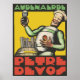 ¿Necesita ayuda para crear otro tamaño? (en pulgadas o centímetros). Póngase en contacto con nosotros a través del botón de contacto situado encima de esta descripción. Arte vectorial propio, inspirado por una postal de arte deco anunciando (finales de los años 20). Una figura, que parece una muñeca de madera, está disfrutando de una cerveza (o 7).