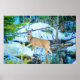 Impresionante pintura acuarela de ciervo de cola blanca en invierno nieve afuera en la naturaleza en los árboles de cedro.
