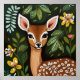Un ciervo adorable, un joven flor, se asoma de las hojas y las flores.