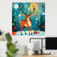 Un ilustracion encantador de ciervos adornados con una escena festiva, rodeado de decoraciones y árboles en contra de una velada cubierta de nieve. Los vivos colores de las vacaciones crean un ambiente alegre y acogedor.