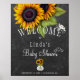 Rústica y elegante caída con poster de señas de bienvenida de la ducha de bebé en pizarra gris oscuro con bollos de girasoles dorados amarillos, tarro de albañil, flores blancas y corazoncitos. Puede optar por personalizar de los tipos de letra y los colores de las letras. — Ideal para un elegante jardín rústico de moda | otoño de verano | fiesta de ducha de bebé en el patio trasero del campo.