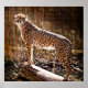 Un joven chita parado en un tronco y mirando a lo lejos. El animal está iluminado por el sol matutino.