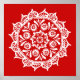 Esta mandala blanca se sienta sobre un fondo rojo brillante. El color es enérgico y cálido. Parte de la colección Brosya Mandala.