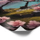 A Japanese-style drawing of a cherry tree. The cherry blossoms are in full bloom, with white and pink petals scattered on the ground. The background is a serene landscape with a traditional Japanese building and a bridge over a calm body of water. Perfect for your home decor!
