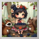 A sweet fairy tale poster for a child's room. A cute little cartoon chibi fairy eating blackberries with her forest friends, a raccoon and squirrel.