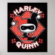 Echa un vistazo a Chibi Harley Quinn mientras hace las divisiones delante de un fondo de diamante de polka rojo con su nombre escrito a su alrededor.
