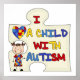 Una gran pieza de rompecabezas, un corazón compuesto de piezas de rompecabezas, un chica de la morena con figura de palos y un texto que dice "Amo a un niño con autismo" sobre camisetas, tazas, tarjetas, pegatinas, bolsas de té, imanes, cadenas de claves, revistas, ratones y otros artículos de ropa y regalo.