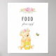 Cartel de la mesa para los clientes de la ducha para bebés. Oso de peluche chica con una banda de cabeza floral y un barril de miel viendo sonar una linda abeja. Flores rosas y amarillas en la parte superior.