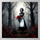 +AI ART+ chica robot gótico con flores rojas y su gatito resplandor parado en un bosque. ¿Eres su verdadero amor? Te está esperando.