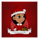 Un poster con un ilustracion de un lindo chica hispano/hispano/asiático con el pelo largo y negro, vestido con ropa de Navidad y llevando un gorra de Papá Noel rojo y con un regalo; vacaciones de Navidades diseño con un fondo rojo, con un texto editable para tu nombre o mensaje