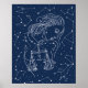 Una fantasía gráfica ilustracion lineal blanco del signo de Libra zodiac sobre un fondo azul marino. El cuadro representa a un chica entre las constelaciones celestes, en su cuello un collar con escamas, en el que un tazón es un corazón, y en el otro -un cráneo.