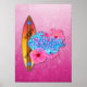 Diseño chica surfista con salpicaduras de agua, tabla de surf de estilo retro con tortugas honu hawaianas y flores de hibisco rosa.