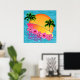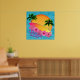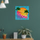 Chica surfista con tablas de surf, palmeras, puesta de sol y flores de hibisco.