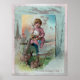 Saludo de Pascua Un chica con un vestido rosado y medias azules, está sentado en una cerca y sosteniendo un conejo blanco. Su gorra está en su regazo y lo está usando para sostener huevos de colores. En esta antigua tarjeta de cine victoriana de los años 1890 hay dos conejillos más en el suelo.