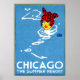 C. 1912 poster de promoción de viajes a Chicago, Illinois. El poster que representa a una joven que disfruta de un baño en el lago Michigan y lee "Chicago - The Summer Resort".